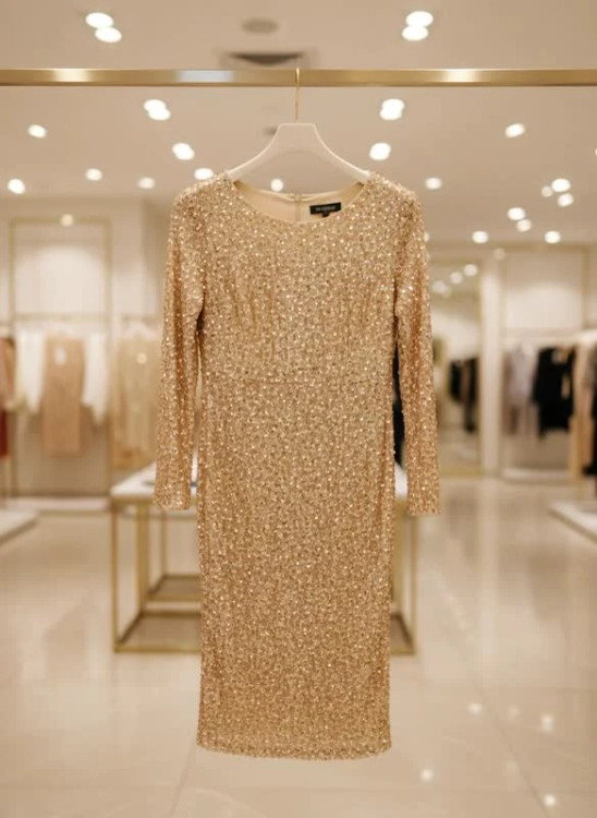 پیراهن مجلسی زنانه Golden Sparkle Dress با طراحی درخشان و پوشیده از پولکهای طلایی، انتخابی فوقالعاده برای مهمانیها و مراسم رسمی است. این لباس با یقه گرد، آستین بلند و فرم جذب شیک جلوهای لوکس و خیرهکننده به استایل شما میبخشد.