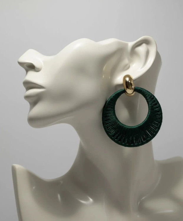 گوشواره زنانه مدل Emerald Threaded Hoop با طراحی حلقهای بزرگ و بافت نخپیچ به رنگ سبز زمردی، جلوهای خاص و مدرن به استایل شما میبخشد. اتصال حلقه با قطعه فلزی طلایی براق، تضاد زیبایی میان رنگ طلایی و سبز ایجاد کرده و این اکسسوری را به گزینهای چشمگیر برای استایلهای فشن، کژوال و هنری تبدیل کرده است. طراحی سبک و متفاوت آن باعث میشود بهعنوان یک اکسسوری شاخص در استایل روزمره یا مهمانیها بدرخشد.