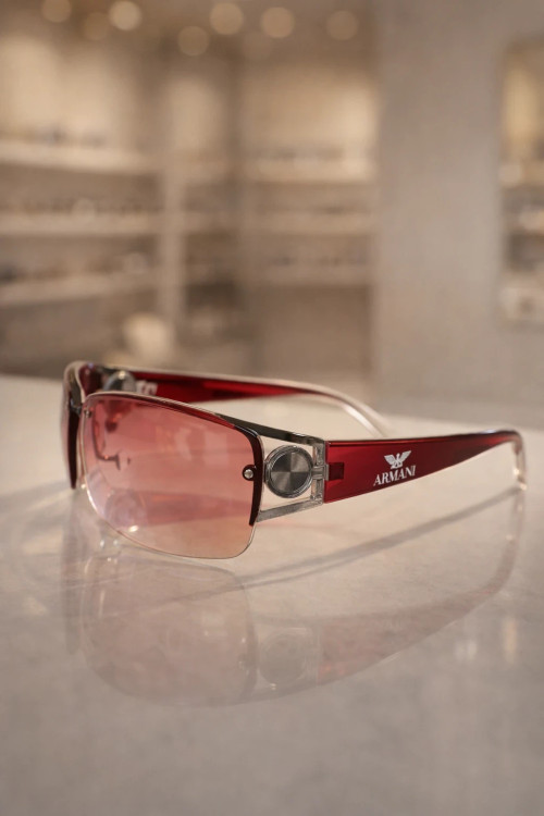 عینک آفتابی لوکس Armani Red Elegance عینک آفتابی با شیشههای گرادیان صورتی و فریم نیمه دوربین شفاف با دستههای قرمز، ترکیبی از استایل منحصر به فرد و کیفیت برتر برای محافظت کامل در برابر اشعه UV.